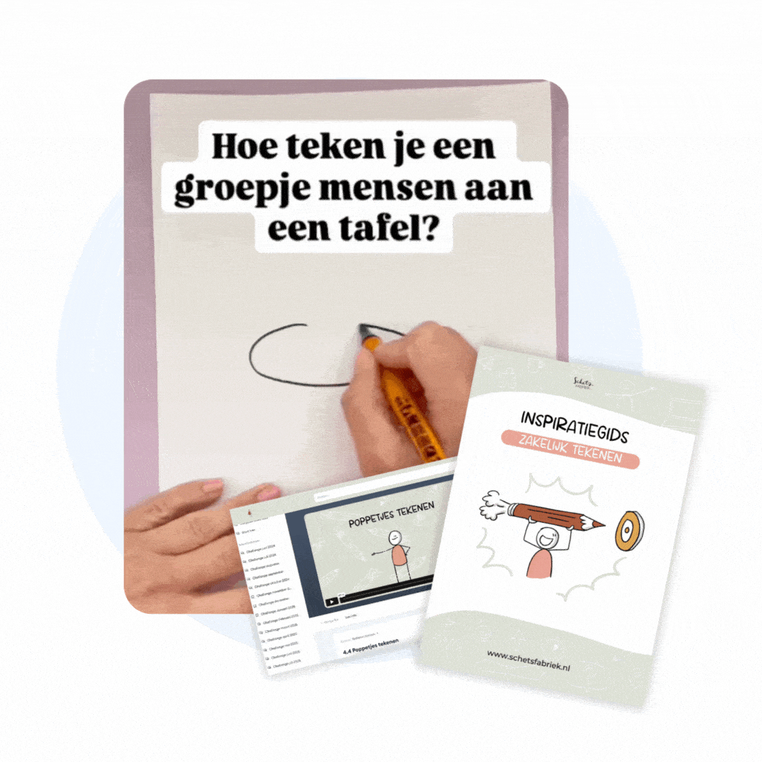Vanaf dat moment begon ze stappen te zetten: ze volgde een opleiding, startte naast haar baan met tekenen voor organisaties en voelde al snel dat hier veel meer in zat. Uiteindelijk ging ze volledig voor zichzelf: dit was het begin van Schetsfabriek en van het terugvinden van haar eigen passie.